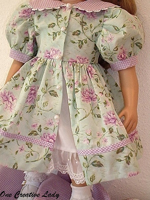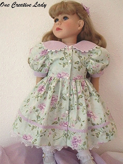My Twinn Christina is all dressed up and ready to celebrate Mothers Day. Her beautiful dress is a pale aqua cotton printed with lavender peonies with green leaves. It has short puffy sleeves, full skirt and peter pan style collar. Her collar, sleeve bands and accent trim around her dress skirt are made from a tiny lavender gingham. The collar is trimmed with a delicate white venise lace. The sleeves have sewn in sleeve heads to keep them puffy. The dress fastens down the front with hidden sewn in snaps and is accented with white faux pearl buttons. Under her dress she is wearing a half slip made from a light weight taffeta with a ruffle made from an embroidered oraganza. To finish off her Mothers Day outfit I have included a pair of lavender barrettes. Each one has a bow made from satin and organza ribbon and is topped off with a satin ribbon rose bud. |