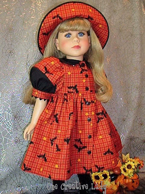 My Twinn Christina is all dressed up for Halloween in her new outfit from One Creative Lady. Her dress has an empire waist, one piece peter pan style collar and split sleeve. The dress fabric is a pretty pumpkin orange plaid printed with black bats and yellow stars. The collar and sleeve inset are made from black cotton. The sleeve bands and collar are trimmed in black rick rack. The dress fastens down the front with sewn in snaps and is accented with 7 black buttons. The hem is sewn in by hand with almost invisble stitches. The black micro fiber tights were also included. These are purchased tights of very high quality! As a finishing touch to her outfit she is wearing a completely reversible cargo style hat. It has the bat and stars print on one side and black cotton on the other. The brim is trimmed with black piping. |