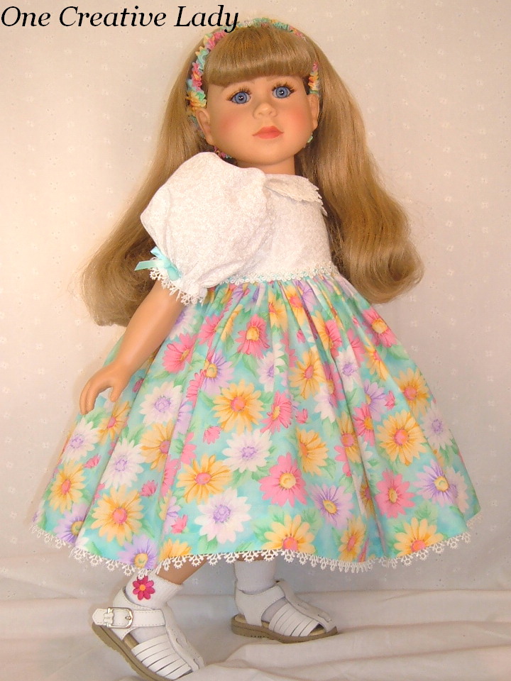 Bright Daisies is a 4 piece ensemble for My Twinn by One Creative Lady. Bright colored daisies on an aqua background decorate the full skirt of this pretty ensemble. The blouse portion of this dress is made from a white tone on tone cotton and is fully lined. The collar, sleeves and skirt are all trimmed in a petite white venise lace. Aqua satin ribbon under a white daisy venise lace accent the bottom of the bodice and aqua ribbon bows accent the sleeves. The dress fastens in the back with sewn in snaps and the hem is sewn in by hand with nearly invisible stitches. Under her dress Christina is wearing a simple petticoat of crinoline with an enclosed elastic waist. Socks and headband were also included. |