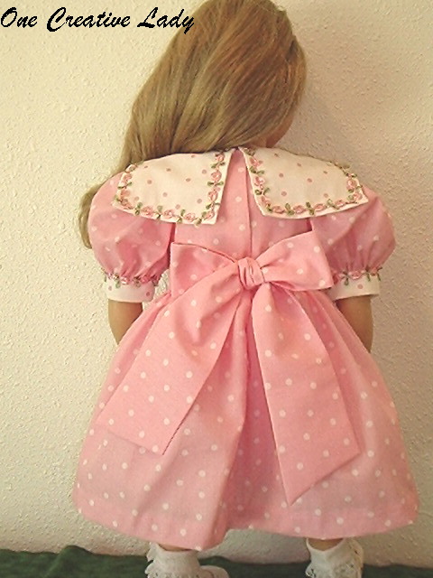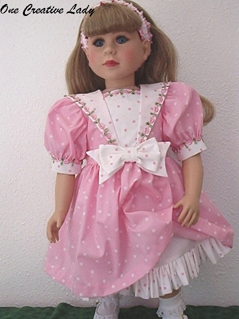 One Creative Lady presents "Cotton Candy Pink" designed to fit the 23" My Twinn dolls & other dolls with similar body types. My Twinn Christina is feeling very summery in her new outfit. The short puffy sleeves, dress skirt, bodice and self fabric ties are all made from the white polka dots on a cotton candy pink background fabric. The sailor style collar, bodice inset, sleeve bands and bow are all made from the pink polka dots on white background. The collar, inset & sleeve bands are all trimmed in an adorable trim of pink buds and green leaves. The dress fastens in the back with sewn in snaps and the hem is sewn in by hand with almost invisible stitches. Under her dress Christina is wearing a petticoat made from a crisp white broadcloth with a very full ruffle made from the pink polka dots on white fabric. The petticoat has an elastic waist for ease in fit. To add a finishing touch to her new outfit Christina is wearing a headband made from both of the fabrics used in her dress.. |