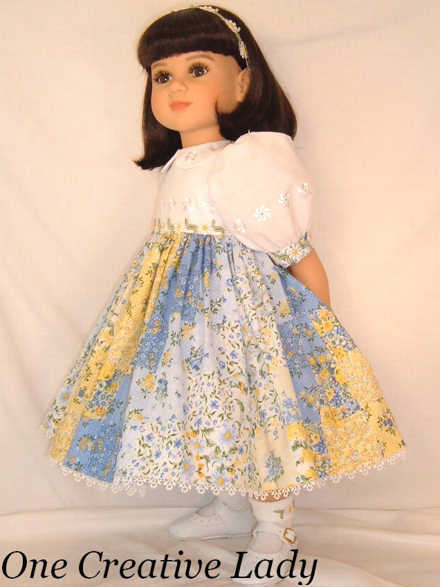 Daises are popping up all over in this creation from One Creative Lady. This outfit has been designed to fit 23" My Twinn dolls and other dolls of similar size. The fully lined bodice is made from a pretty white embroidered eyelet as are the short puffy sleeves and peter pan style collar. It fastens in the back with sewn in snaps. The dress skirt is a very full 90 inches and is a patchwork of flowers in blues, whites and yellows. The bottom is trimmed with a delicate white venise lace and the hem has been sewn in by hand so no unsightly stitches are showing. An embroidered daisy trim in white, yellow and green accents the bottom of the bodice and the sleeve bands. I have used this same trim to make her matching headband which fastens with a sewn in snap. Under her dress Katie is wearing a petticoat made from white broadcloth. It has an enclosed elastic waist and a full eyelet ruffle along the bottom. Also included are a pair of white socks that have been decorated with daises to match the rest of her outfit.
