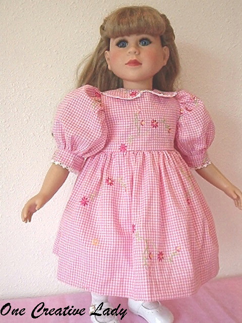 This is a One Of Kind outfit for My Twinn by One Creative Lady. The dress is made from a pink and white gingham chambray embroidered with pink daisies and green leaves. The peter pan collar and sleeve bands are trimmed with a white crocheted lace. The dress hem is sewn in by hand with almost invisible stitches so there are no unsightly seam lines showing. The dress fastens in the back with sewn in snaps. Under her dress My Twinn is wearing a white broadcloth petticoat. The petticoat ruffle is made from a very full white cotton embroidered with flowers. It has an elastic waist for ease in fit. The 2 barrettes are made from pink grossgrain ribbon with a white venise lace daisy in the center. |