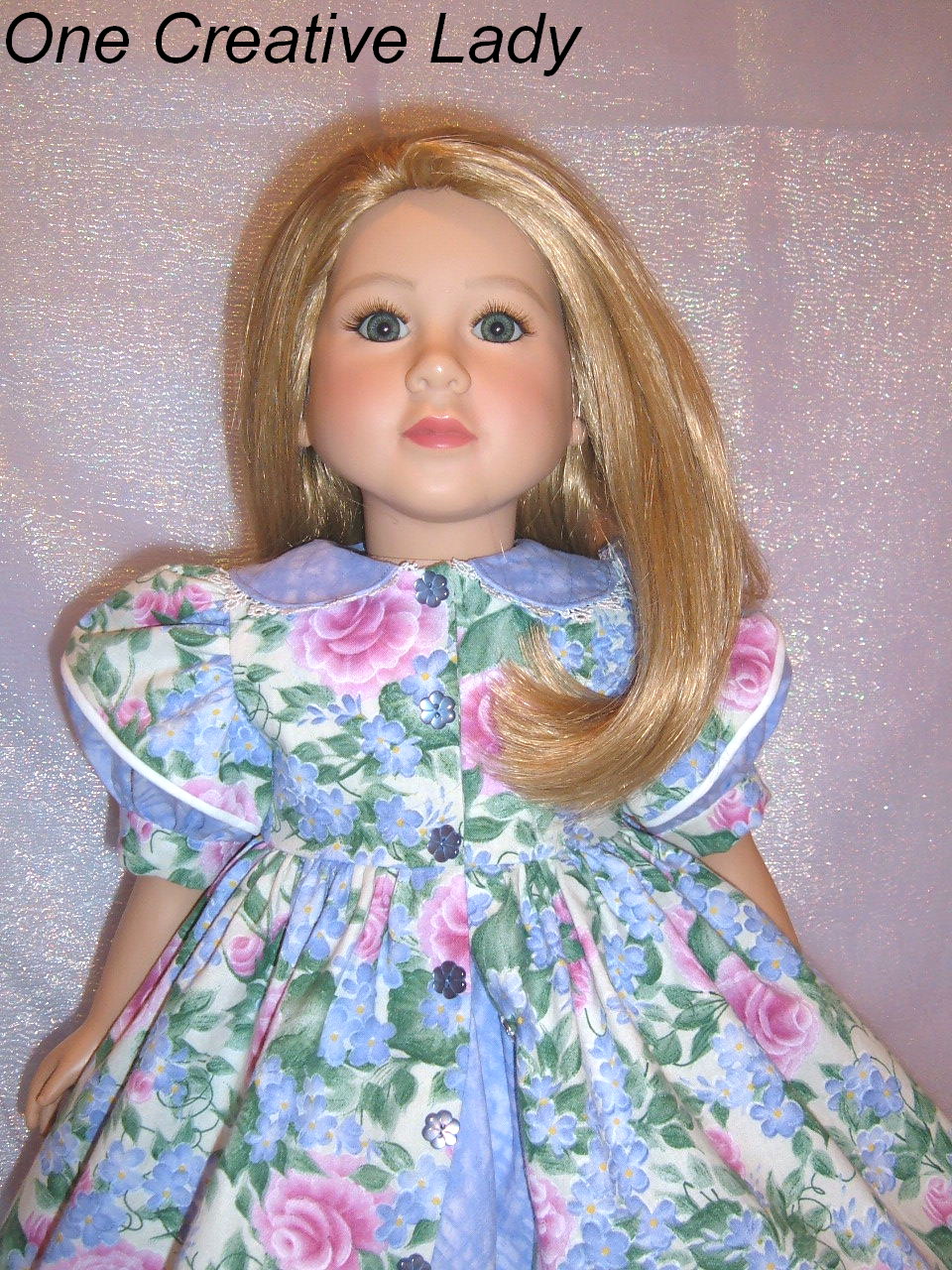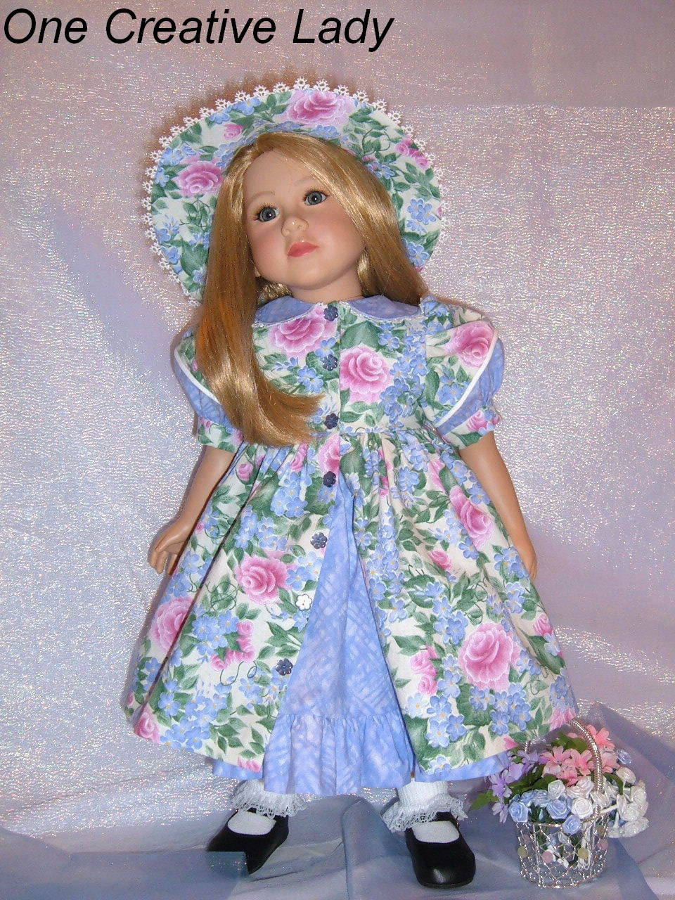 My Twinn Cookie is modeling another creation "Lavender & Roses" from One Creative Lady. This outfit consists of 3 pieces and was designed to fit My Twinn and similar 23" dolls. Her dress is made from a popular print designed by Donna Dewberry and has gorgeous pink roses, purple flowers and green leaves all on an ivory background. The collar and lower portion of the split sleeve are made from a coordinating lavender. The split sleeve is trimmed with white piping and the collar is trimmed with white venise lace. The dress fastens down the front with sewn in snaps and is accented with purple flower shaped buttons. The hem is sewn in by hand so there are no unsightly stitches showing. Under her dress Cookie is wearing a matching purple petticoat with an elastic waist and full self fabric ruffle. Doesn't the petticoat looks sweet peeking out from under the hem of her dress? To complete this outfit is a completely reversible hat with a brim trimmed in white venise lace. One side of the hat is the floral print and the other is the lavender.