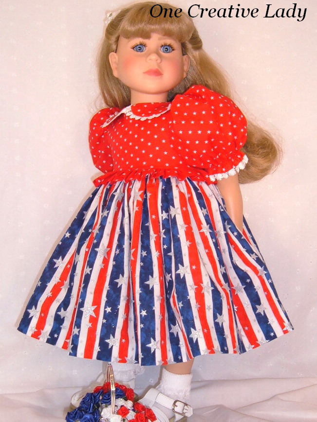 Christina is showing her Patriotic Pride in the latest creation by One Creative Lady. This pretty little dress was designed to fit My Twinn and other 23" dolls of similar body style. The dress bodice is fully lined and made from red fabric printed with white stars. The short sleeves and collar have been trimmed with white venise lace. A ruffled peplum of the same fabric adds a festive look to the bottom of the bodice. The dress fastens in the back with sewn in snaps so there isn't any Velcro to snag their delicate skin. The skirt fabric has stripes in red, white and blue and is scattered with stars in metallic silver. The dress has been hemmed by hand for that professional finish. A sewn in slip of crinoline keeps her skirt nice and full. The finished length of the dress is 14 1/2 inches from the back of the neck and the chest measures 16 inches. |