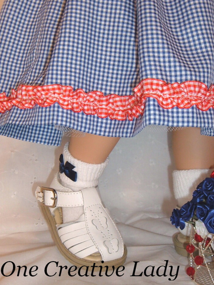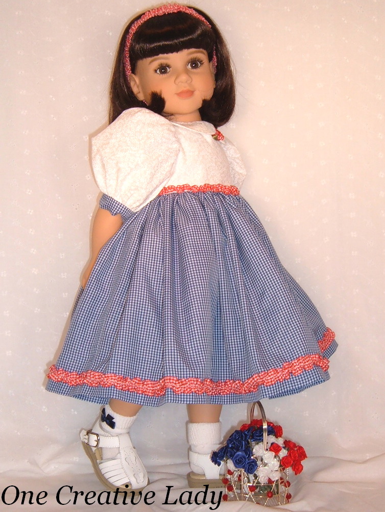 Hurray for the Red, White & Blue! Katie is thrilled to be modeling the latest creation from One Creative Lady. This fun dress would be great for a Summer picnic or a trip to the zoo or even the Memorial Day celebrations! The bodice is made from a white on white cotton. It is fully lined, has a peter pan collar and short puffy sleeves. A gathered ruffle of red gingham accents the bottom of the bodice and can also be found around the bottom of the dress skirt. Sleeve heads sewn into the sleeves keep the sleeves nice and puffy. A red gingham carnation adds a touch of whimsy to the collar. The dress skirt is made from navy blue and white gingham and is a full 90" to make it perfect for twirling! A simple slip of crinoline is sewn in to the skirt to keep it nice and full. The dress fastens with sewn in snaps. A scrunchie style headband made from red and white gingham was also included. This was a One Of A Kind creation and will not be duplicated. |
