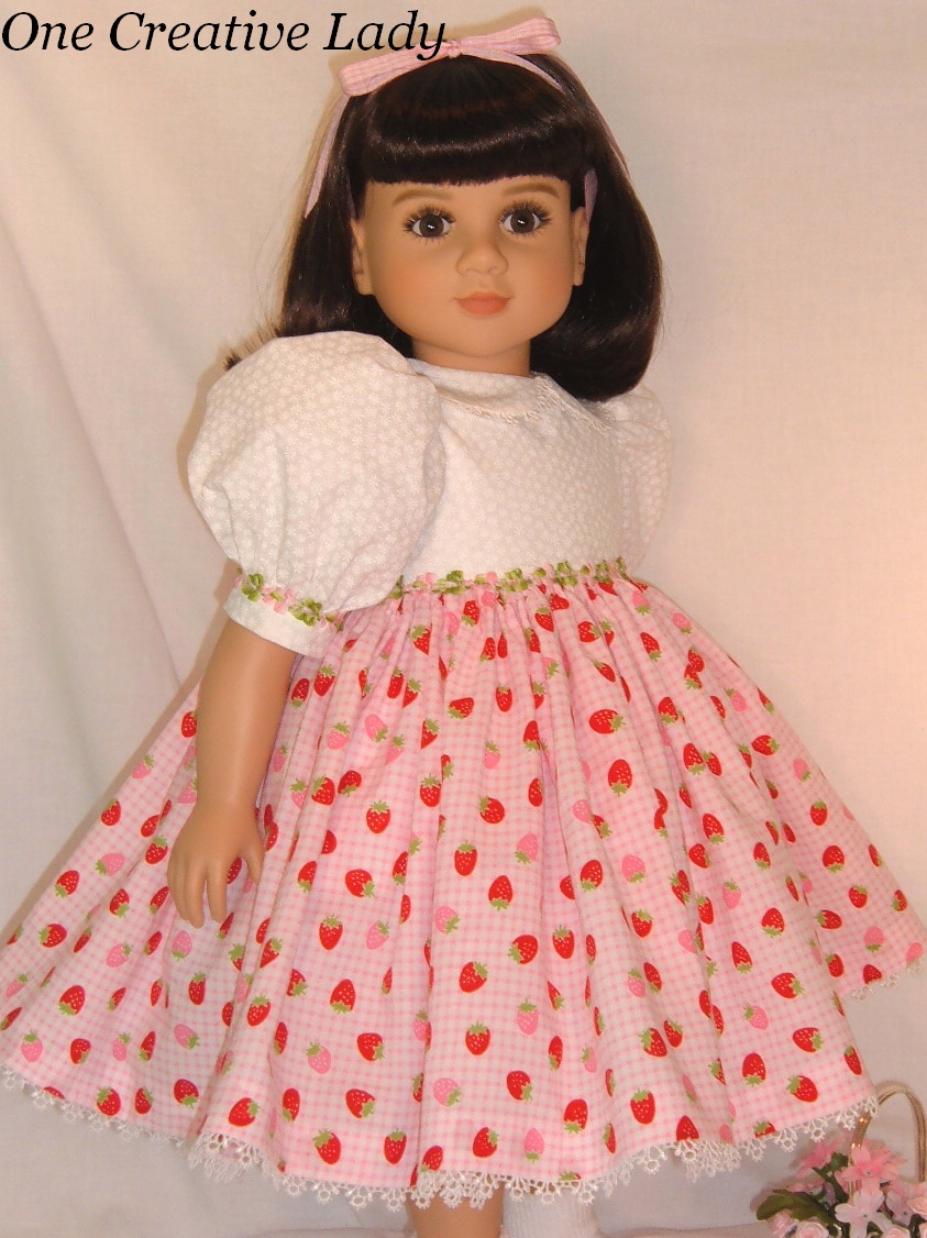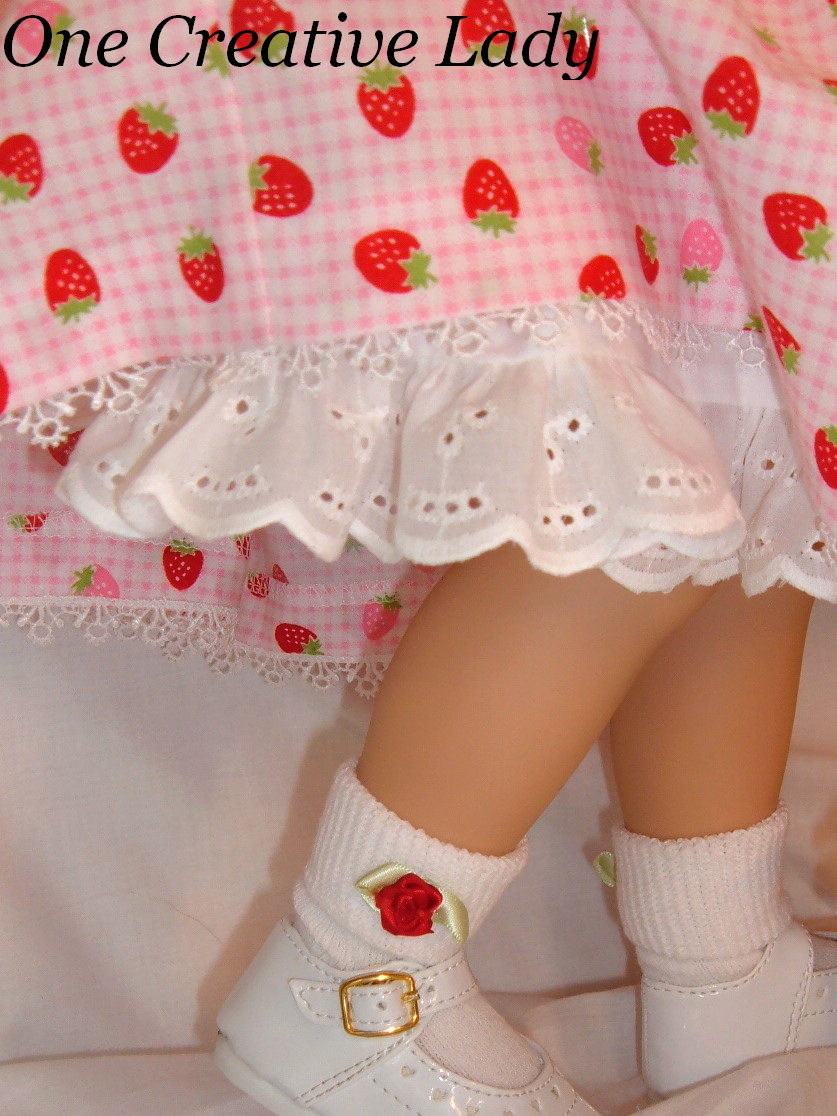 Katie is ready for a Summer Picnic in "Strawberries on Gingham" from One Creative Lady. This adorable little dress has a white on white cotton bodice with short puffy sleeves and peter pan style collar. A petite white venise lace trims the collar and a rococo ribbon trim of pink, white and green trims the sleeve bands and the bottom of the dress bodice. Sleeve heads have been sewn in to keep the sleeves nice and puffy. The dress skirt is a full 90 inches and is a light pink and white gingham printed with juicy red and pink strawberries. The bottom of the skirt is trimmed with white venise lace and the hem has been sewn in by hand so no unsightly stitches are showing. The dress fastens in the back with sewn in snaps. Under her dress Katie is modeling a white broadcloth petticoat with an enclosed elastic waist and a full eyelet ruffle along the bottom. Her socks are also included. They are white and have been decorated with a red satin rose with leaves on the outside of each sock. I also encluded a pink gingham ribbon for your little girls hair. This was a One Of A Kind creation sold on eBay and will not be duplicated. |